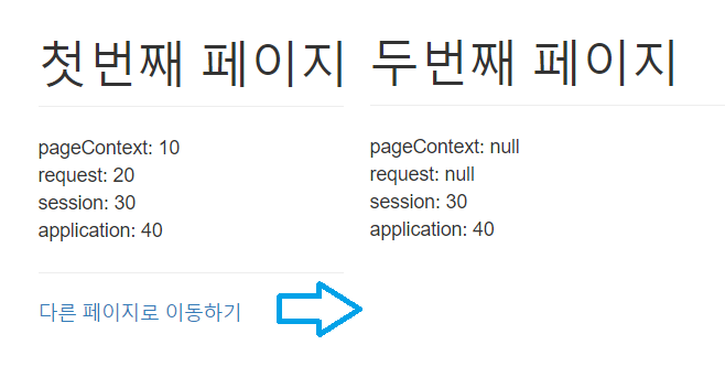 pageContext, request는 데이터 전송이 안됬지만, session, application은 데이터 전송이 된 결과이다.