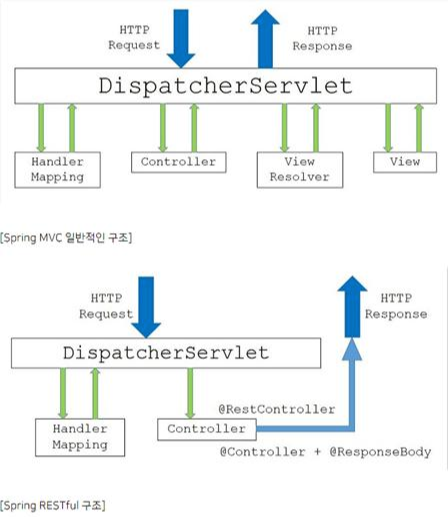 Spring MVC는 DispatcherServlet을 거쳐서 viewResolver를 통해 view로 리턴이 되고 RESTful 방식은 DispatcherServlet을 거치지 않고 바로 웹 브라우저로 json의 형태로 리턴이 된다.