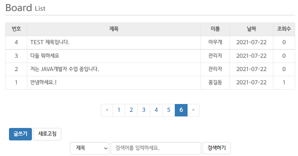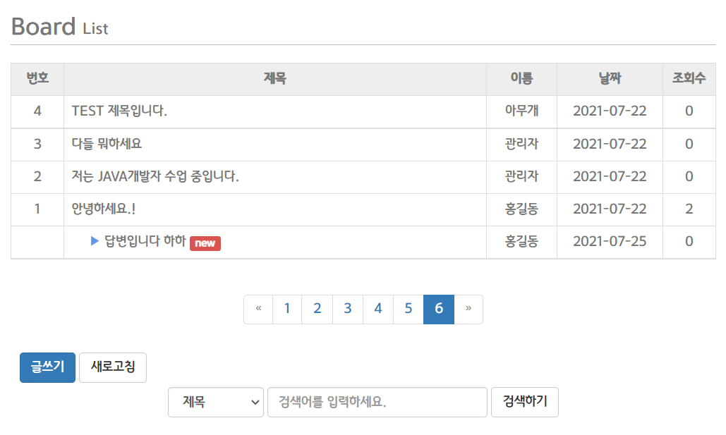 - 게시판 글 답변 쓰고 난 후 페이지 ( http://localhost:8090/myapp/board/list.do?page=6 )